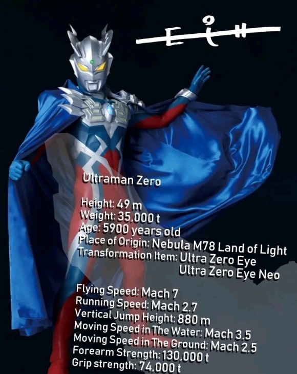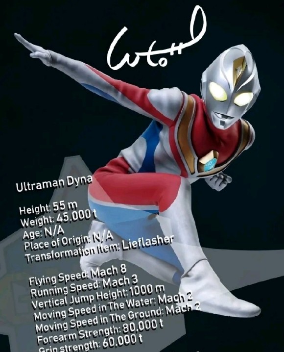 戴拿奥特曼数据:身高:五十五米;体重:四万五千吨;年龄:未知;出生地:未知;飞行速度:8马赫;奔跑速度:3马赫;跳跃高度:1000米;水中移动速度:2马赫;地面移动速度:2马赫;力量强度:八万吨;握力:六万吨;