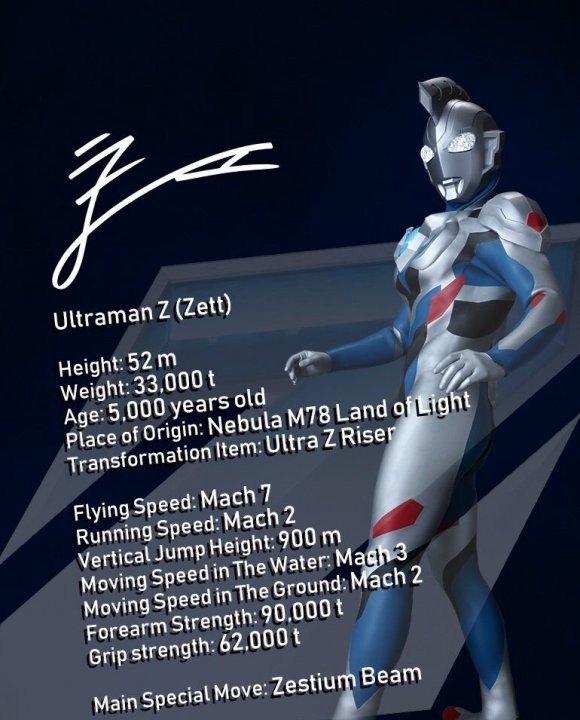 泽塔奥特曼基础数据:身高:五十二米;体重:三万三千吨;年龄:五千岁;出生地:光之国;飞行速度:7马赫;奔跑速度:2马赫;跳跃高度:900米;水中移动速度:3马赫;地面移动速度:2马赫;力量强度:九万吨;握力:六万两千吨;