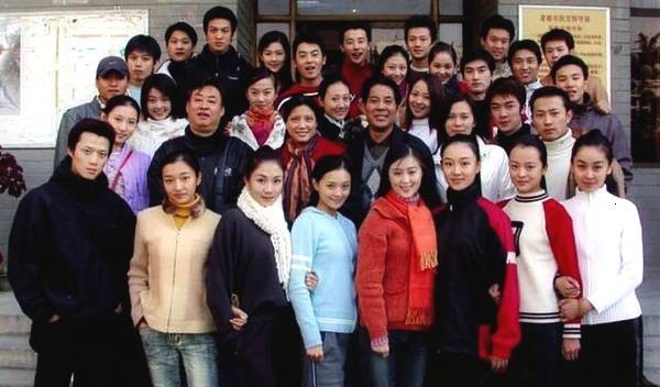 表演系2001班,一眼看过去就可以看到二排右三与右五的黄圣依以及王珞丹,右二的边潇潇,此外还有第一排的贾乃亮。