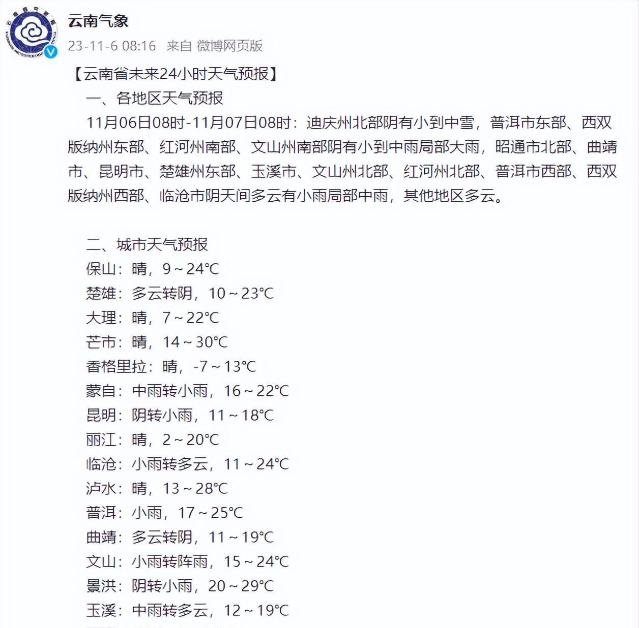 而怒江州北部、昭通市北部、文山州南部、红河州南部、玉溪市南部、普洱市和西双版纳州则会有多云天气,也可能有阵雨。其他地区则会是多云间晴的天气。根据地质灾害的情况来看,从11月5日20:00到11月6日20:00,整个云南省没有发生三级以上的地质灾害。这是一个好消息。在温馨提示方面,首先要提醒大家,11月6日受地面冷空气和南支槽的影响,云南省中东部的日最高气温将下降6-8℃,有些地方甚至会下降10-12℃。这个降温是比较明显的。其次,随着降温的到来,中东部和南部地区可能会有小雨。普洱市东部、西双版纳州东部、玉溪市南部和红河州南部可能会有中到大雨,局部地区甚至会有暴雨。迪庆州北部可能会有小到中雪,局部地区甚至会有大雪。在这个过程中,滇西南地区还有可能出现雷暴和短时强降水等强对流天气。接下来,让我们来看看各地区的天气预报。