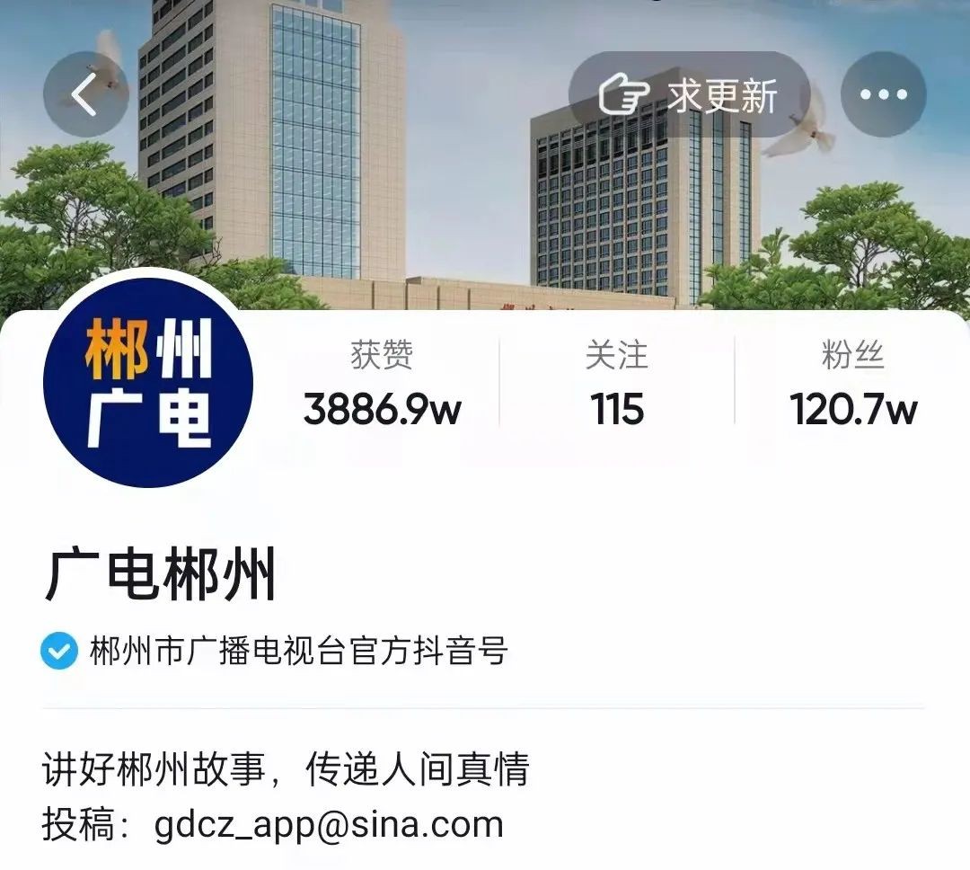 3、抖音搜索关注“广电郴州”,届时点击“广电郴州”头像,即可观看同步直播。