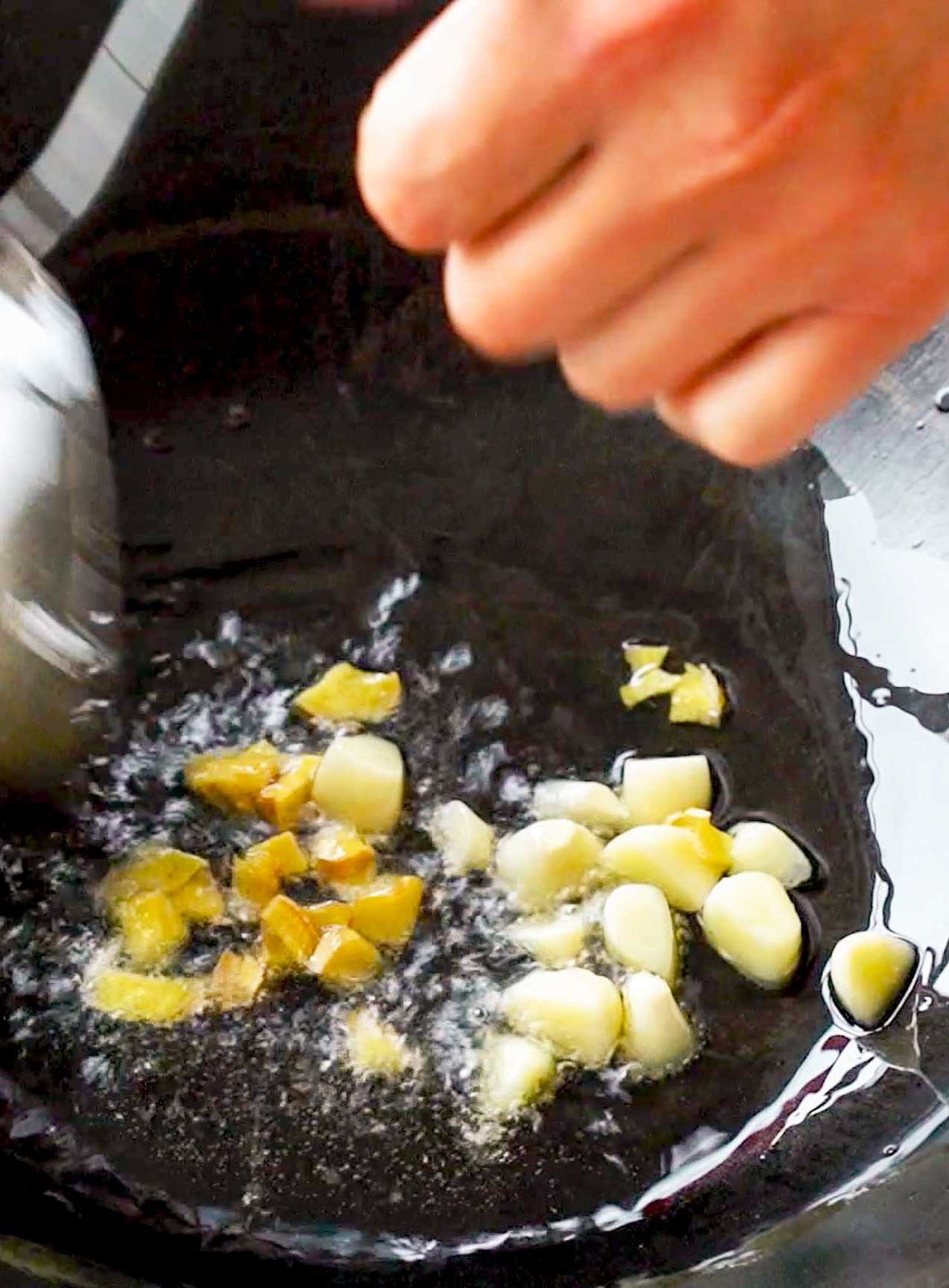锅中倒入30克色拉油,先将蒜粒和姜片下入锅中爆香,炒出香味之后加入小葱段煸炒出香味。