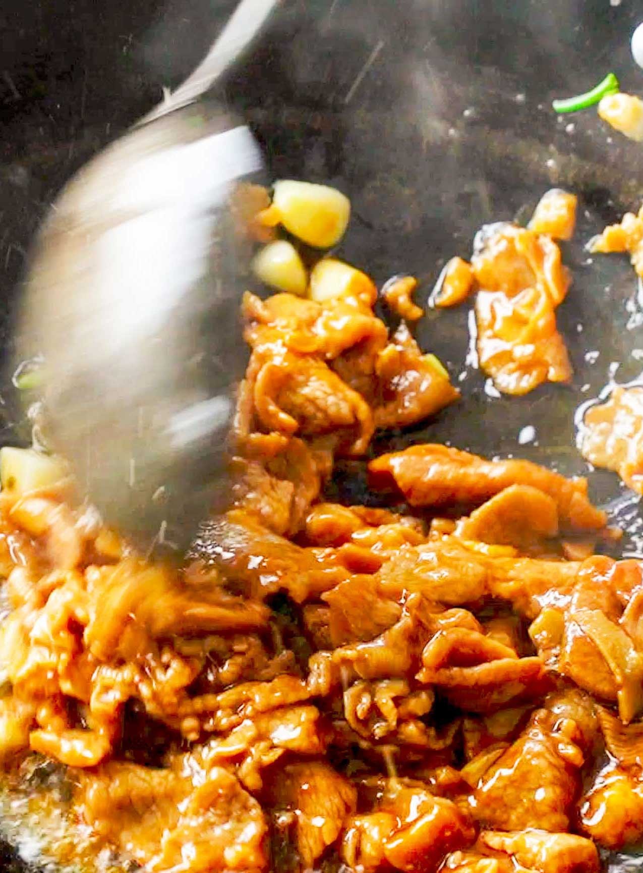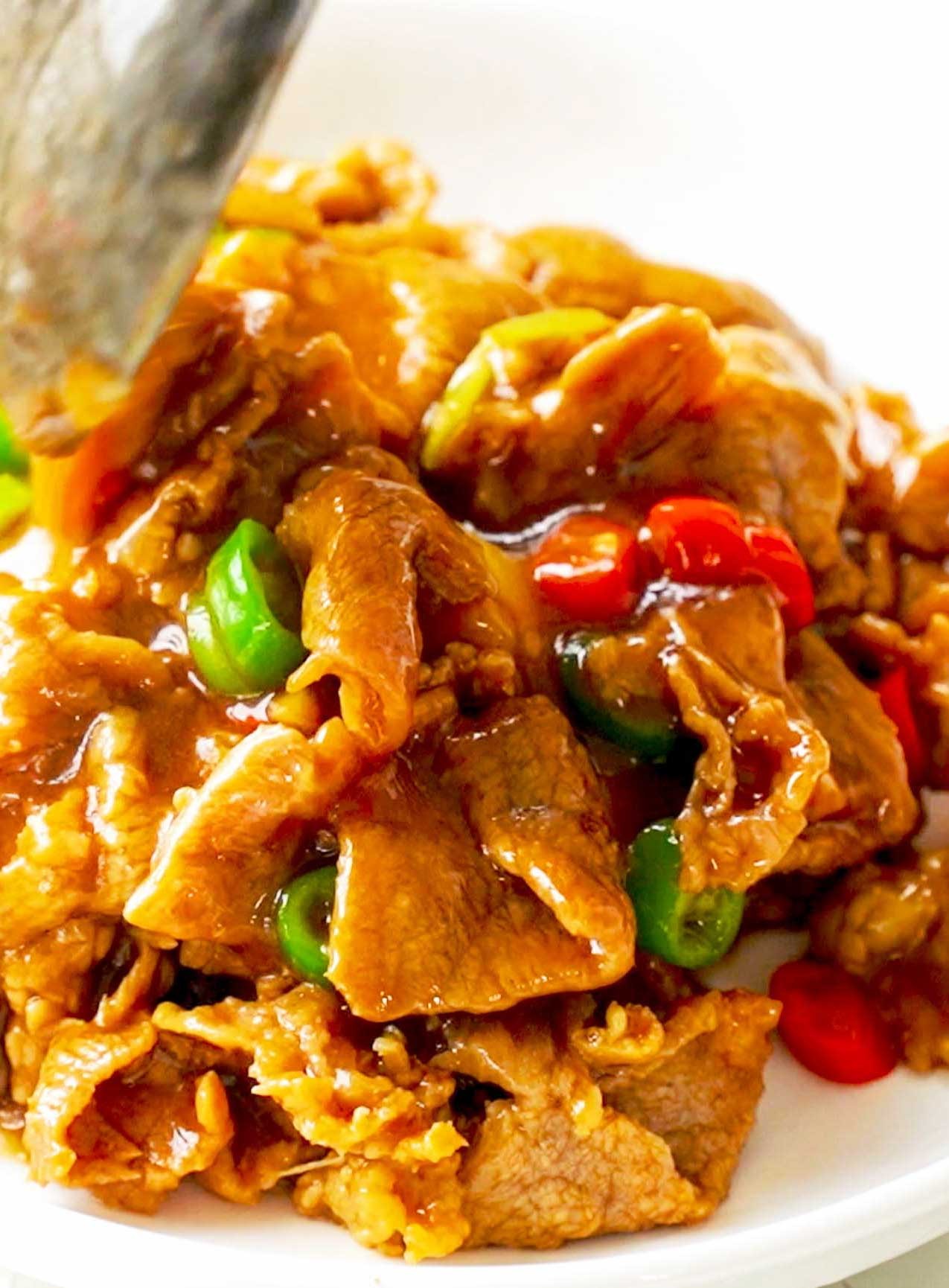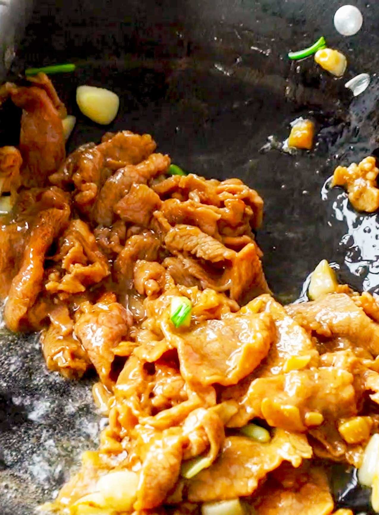 将腌制好的牛肉加入锅中滑熟,牛肉变色后加入调好的料汁,一起大火翻炒,这样更焦香入味好吃。