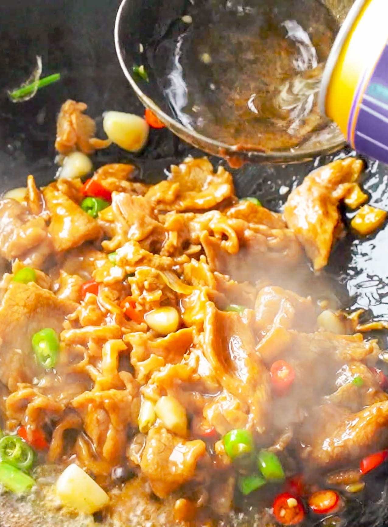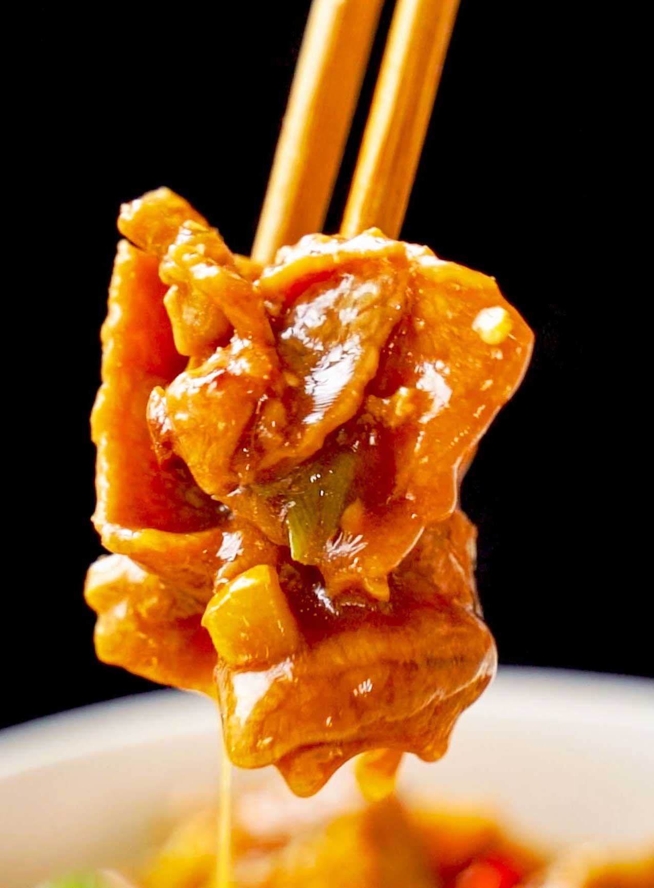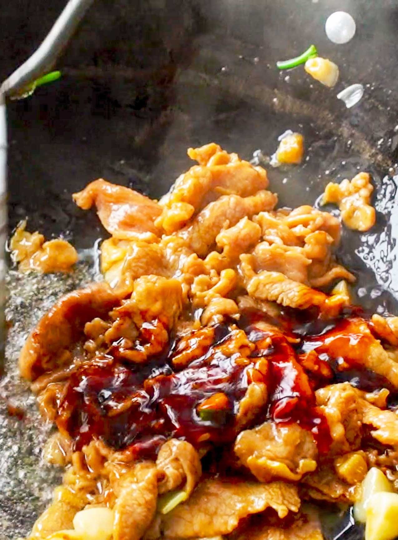 将腌制好的牛肉加入锅中滑熟,牛肉变色后加入调好的料汁,一起大火翻炒,这样更焦香入味好吃。