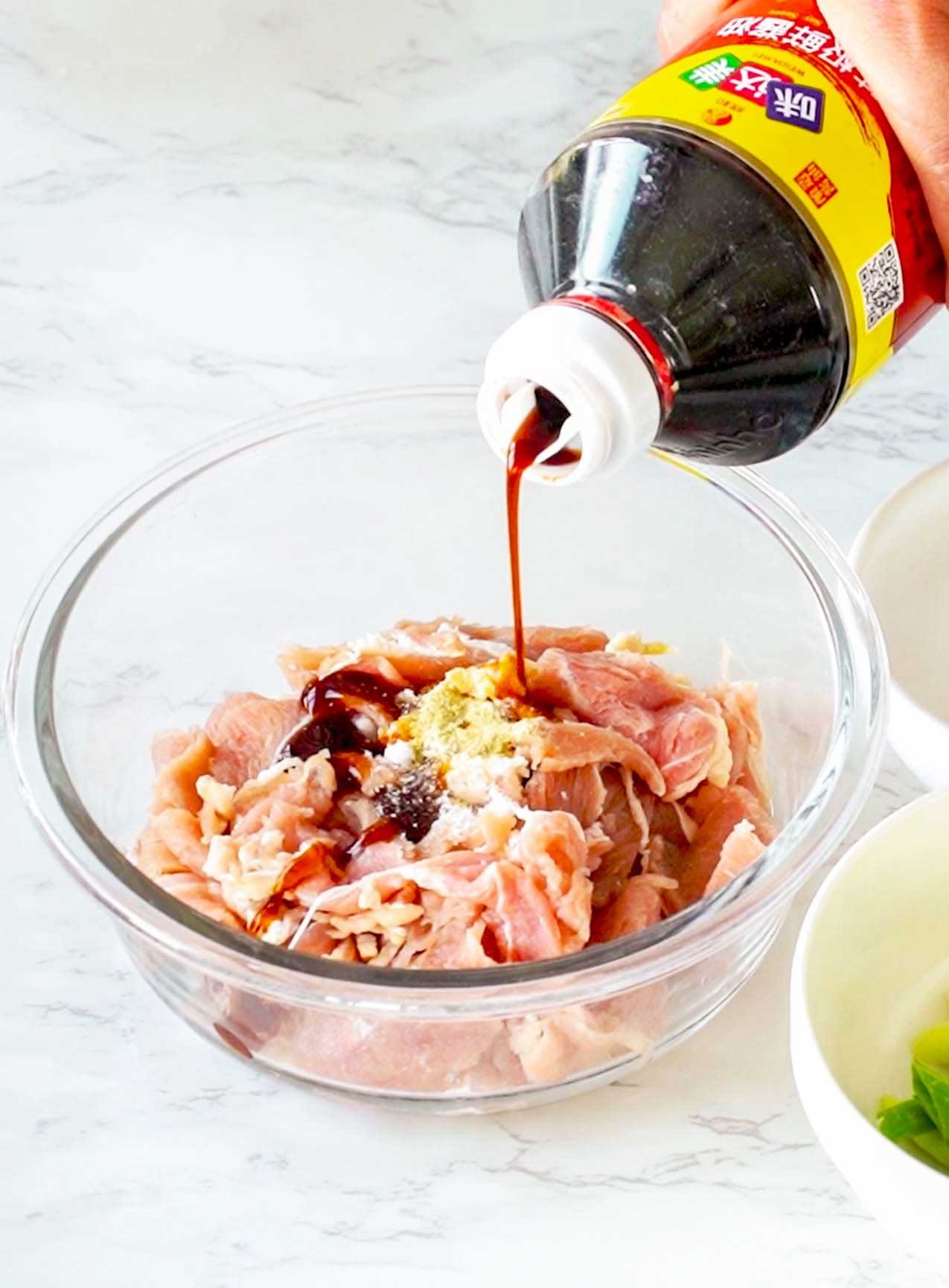 洗干净的牛肉切成薄片,加入10克蚝油、8克生抽、10克料酒、1克胡椒粉、3克白糖、2克老抽,5克淀粉水搅拌均匀。