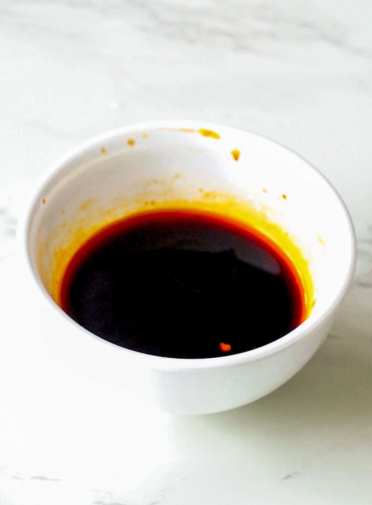 准备一个小碗,碗中加入10克辣椒露、7克生抽、2克老抽、4克料酒、2克耗油、2克白糖,用筷子将料汁搅拌均匀。