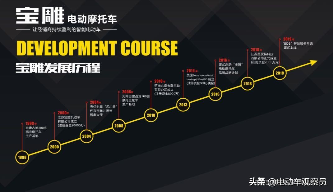 纵观宝雕品牌的发展史,着实拥有雄厚的底蕴。宝雕品牌始建于1998年,2004年,聘请当红影星“孟广美”为品牌代言人,2008年在河南自建160亩三轮摩托车生产基地,2013年,在美国INC成立,全面进军国际市场,2018年,江苏美俊特科技有限公司成立,宝雕电动摩托车品牌战略计划正式启动!宝雕电动车强势崛起,历经风雨更加茁壮成长!