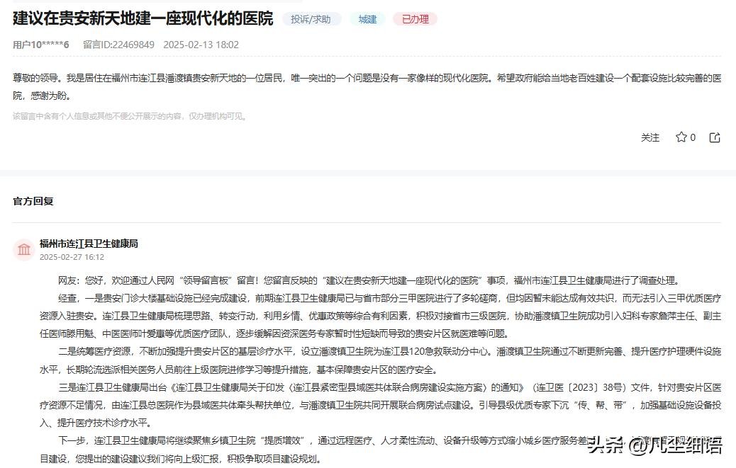 网友建议连江县在贵安新天地建一座现代化的医院 官方回应