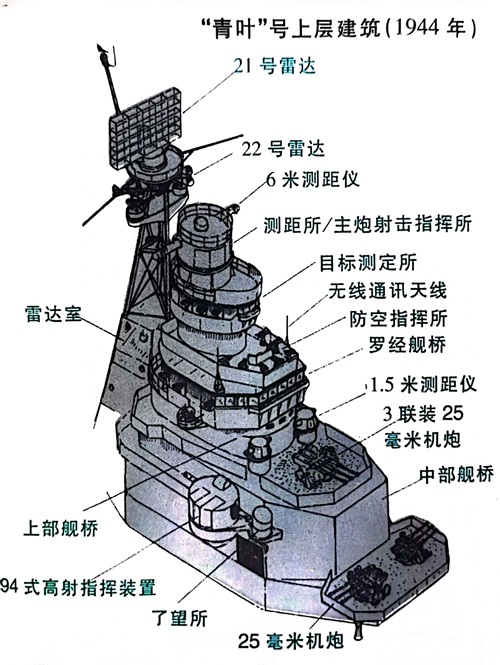 “青叶”号的特点是采用阶梯状塔形舰桥,顶端为圆筒状的射击指挥所,装有方位测定仪;之下是目标测定所,装有目标测定仪;前面设有1号探照灯;在两烟囱之间和后部上层建筑物上各有探照灯1具,以强化舰后方的探照能力;在中部舰桥上设置了方位测定仪环状天线,扩大了防空指挥所,加强了防空火力,提高了射击指挥能力。