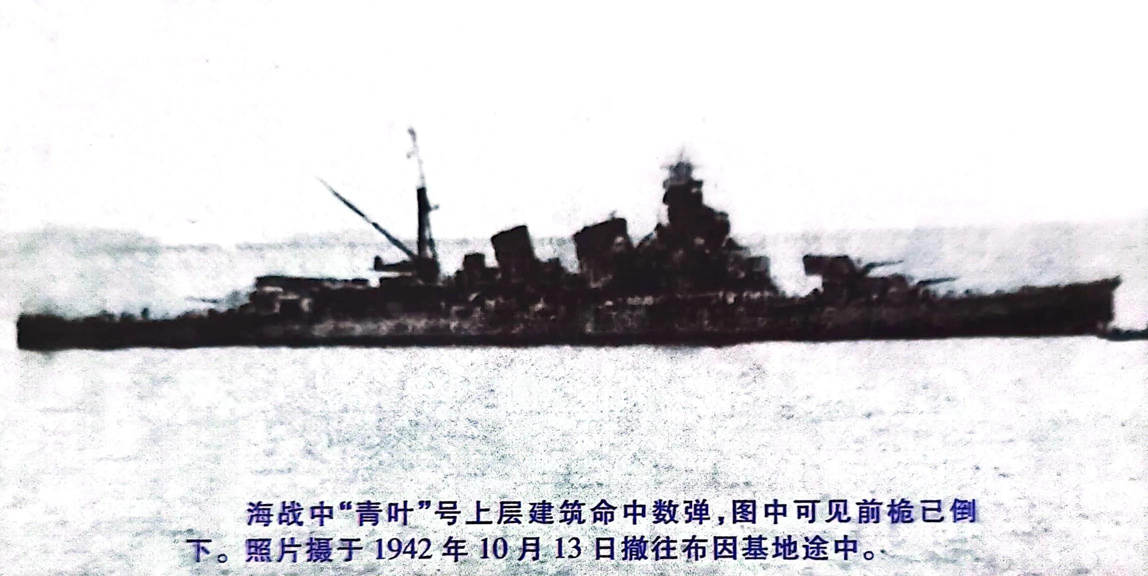 1942年10月10日,“青叶”号参加突袭瓜岛亨德森机场的任务,在埃斯帕恩斯角海域的夜战中遭到美军舰的集中火力打击受到重创。