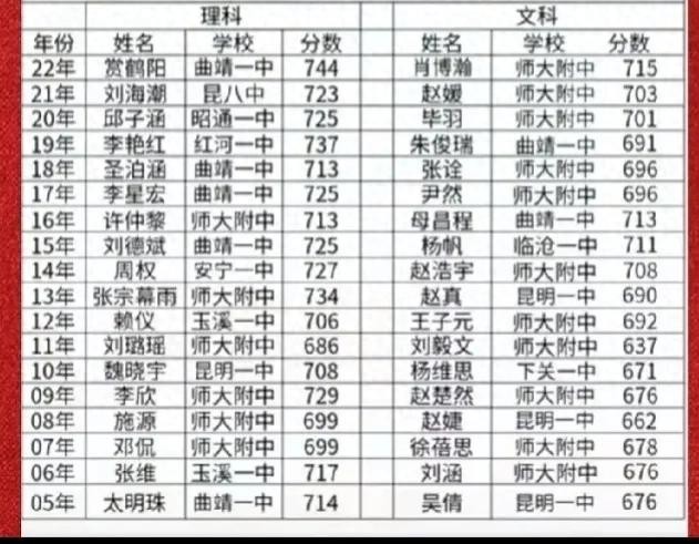 (2024年,文理状元均来自云南师大附中,理科状元罗万成,731分,文科状元702分。)