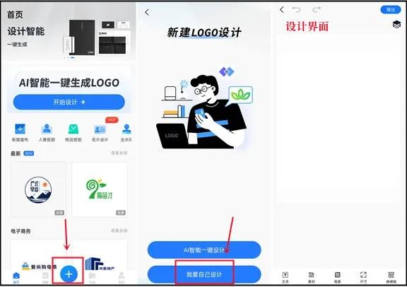 首先我们在手机上打开工具,在工具底部找到【+】图标,点击后在新弹出的页面中点击【我要自己设计】,然后我们就来到了设计界面。