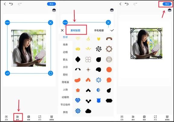 然后我们再次点开【素材】界面,在【素材贴图】中有各式各样的素材供我们,按照自己的喜好来添加调整就好。设计完成后点击右上角的【导出】按钮就可以把成品保存下来啦。