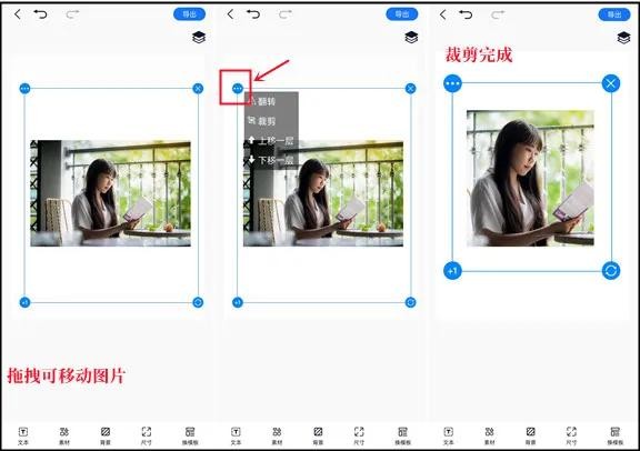 添加完成后,图片就会出现在工作台中,我们可以通过拖拽随意调整图片的大小和位置。点击选框的左上角还可以对图片进行翻转、剪裁等操作。