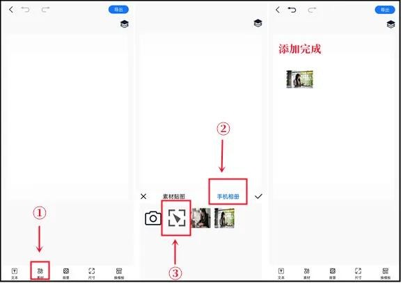 来到设计界面后,我们可以看到界面底部有很多选项,点击【素材】就会弹出一个对话框。在对话框中点击【手机相册】就可以把想要调整的照片添加到工具中。