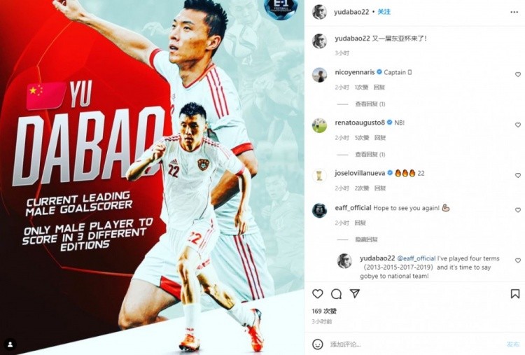 于大宝用一句简短的英文回复道:“我已参加了4届东亚杯,是时候对国家队说再见了。”