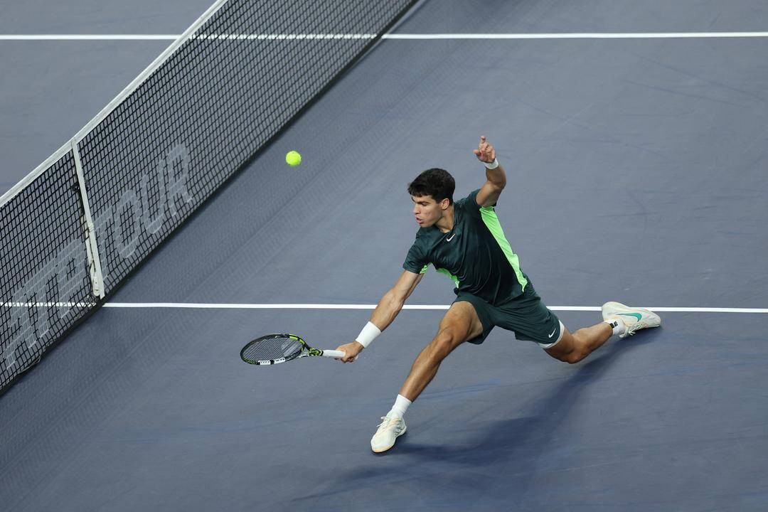 2023年上海劳力士大师赛上,劳力士代言人卡洛斯·阿尔卡拉斯反手击球 ©Rolex/Antoine Couvercelle