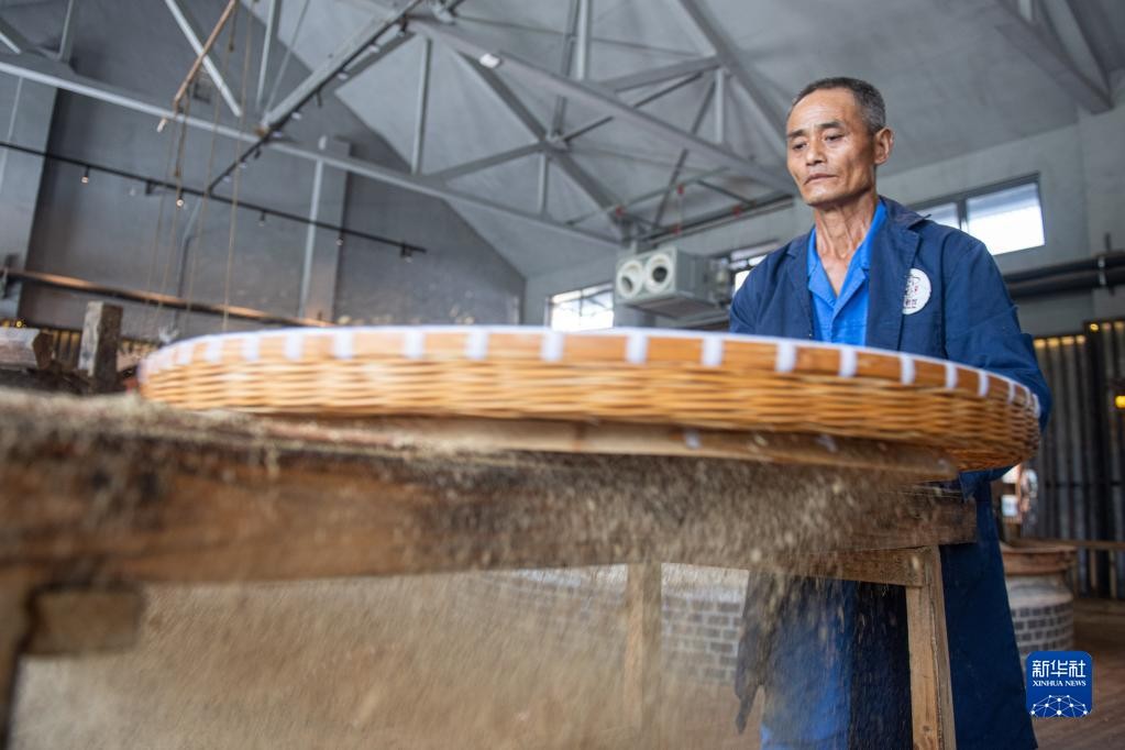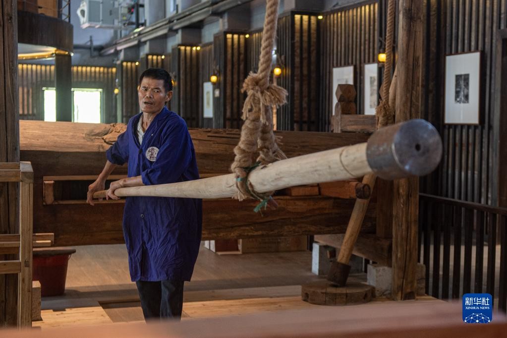 7月5日,常山县芳村传统榨油坊的工人利用传统工艺榨取山茶油。