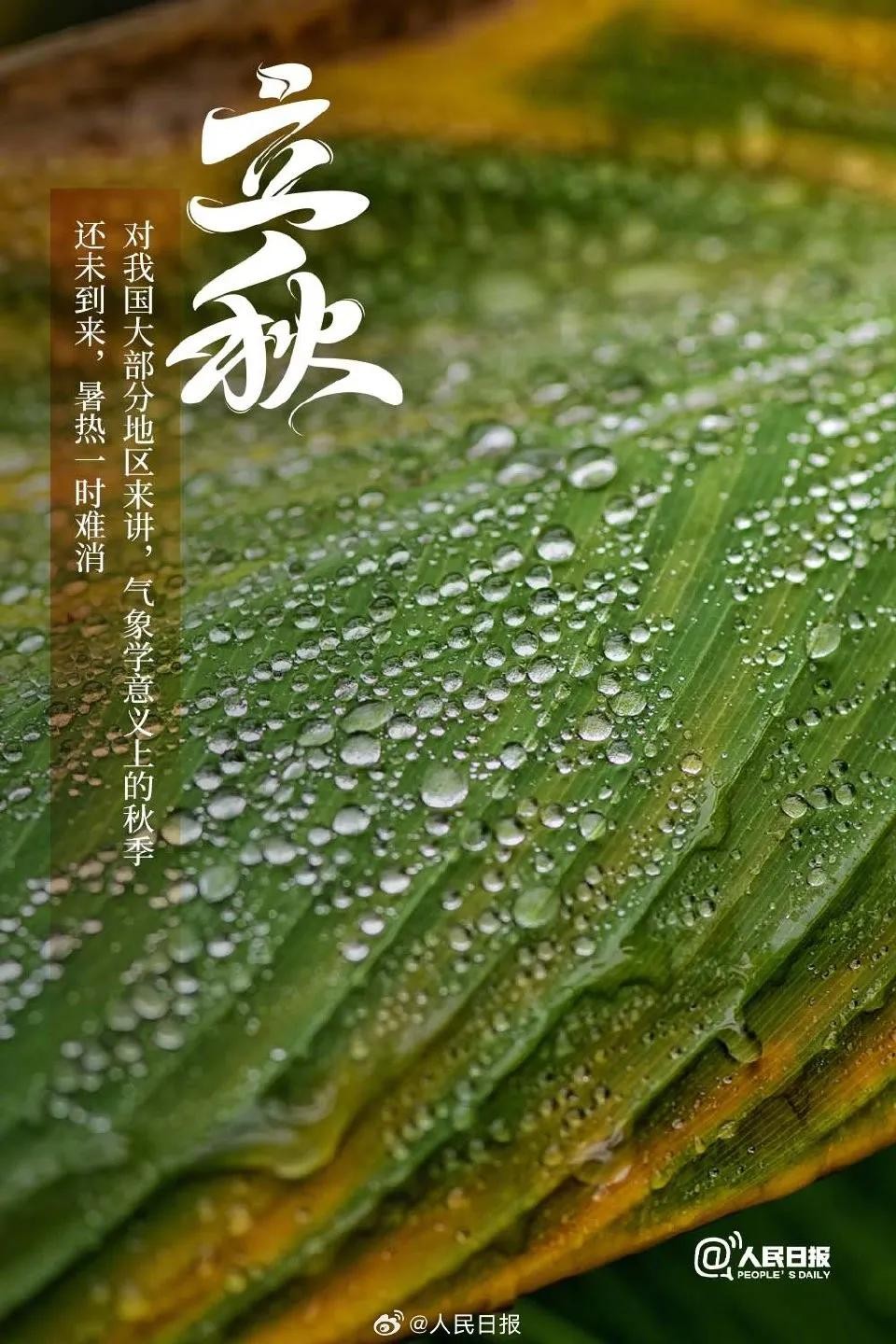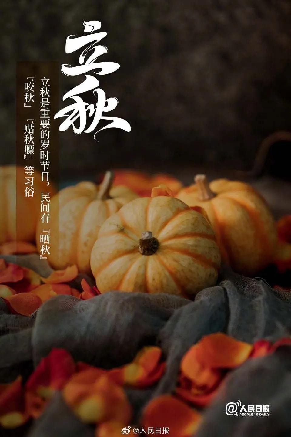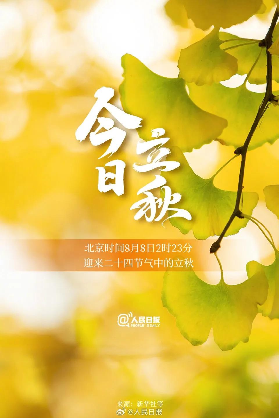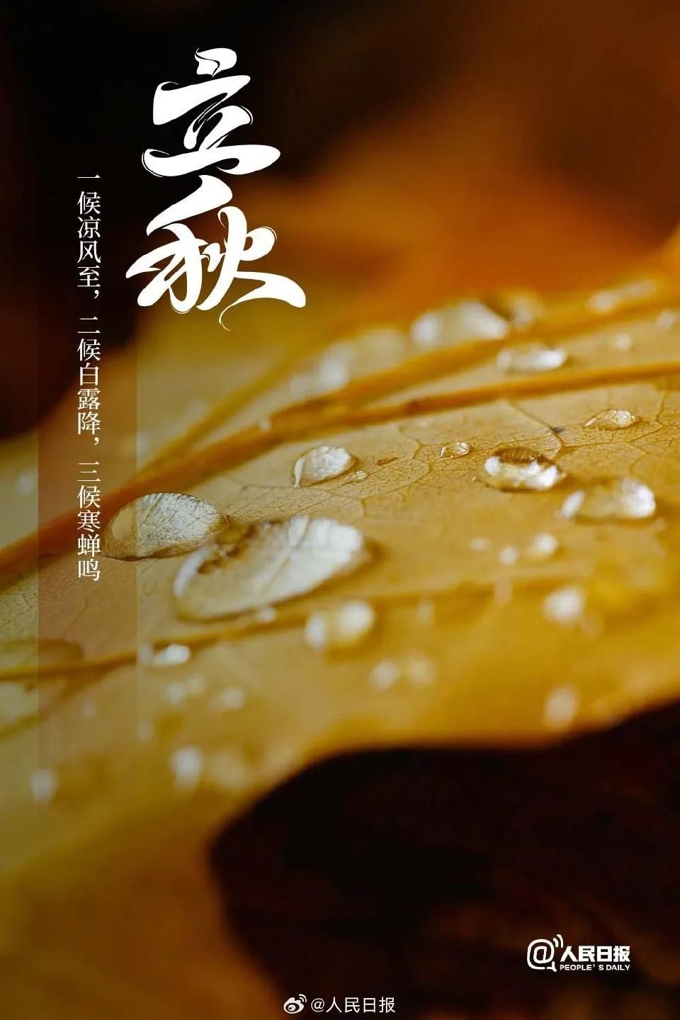 北京时间8月8日2时23分迎来“立秋”节气;立秋三候:一候凉风至,二候白露降,三候寒蝉鸣;#立秋不意味着入秋#:立秋过后,不代表酷热天气结束,需提防“秋老虎”;民间有“贴秋膘”“咬秋”“晒秋”等习俗。你准备好迎接秋天了吗? (人民日报)