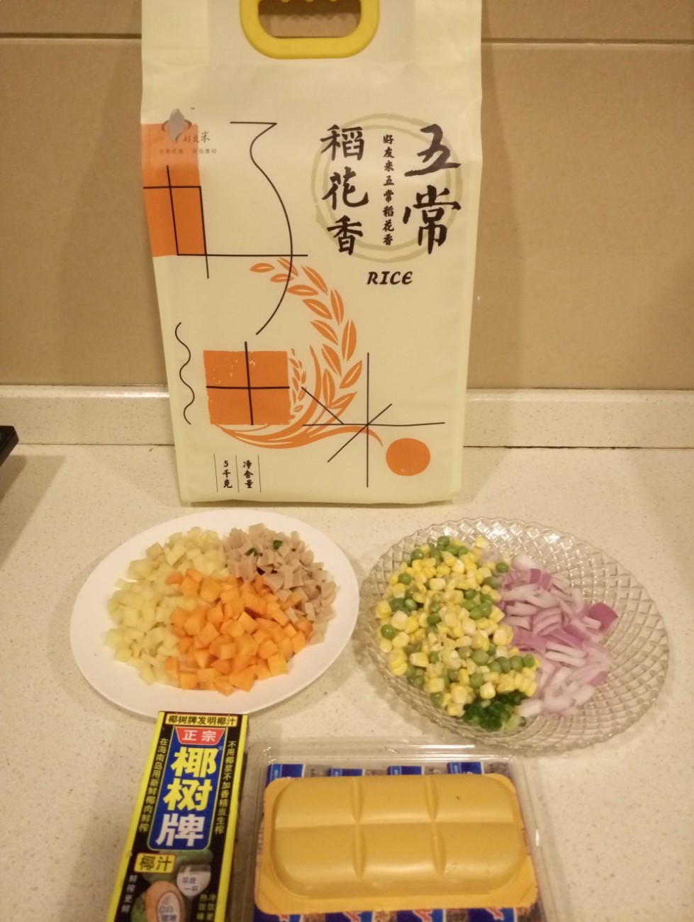 将马铃薯、胡萝卜、香肠切粒,洋葱切碎,玉米和青豆备好待用。