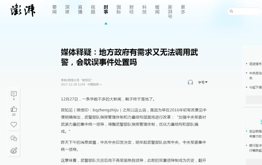 澎湃新闻,媒体释疑:地方政府有需求又无法调用武警,会耽误事件处置吗
