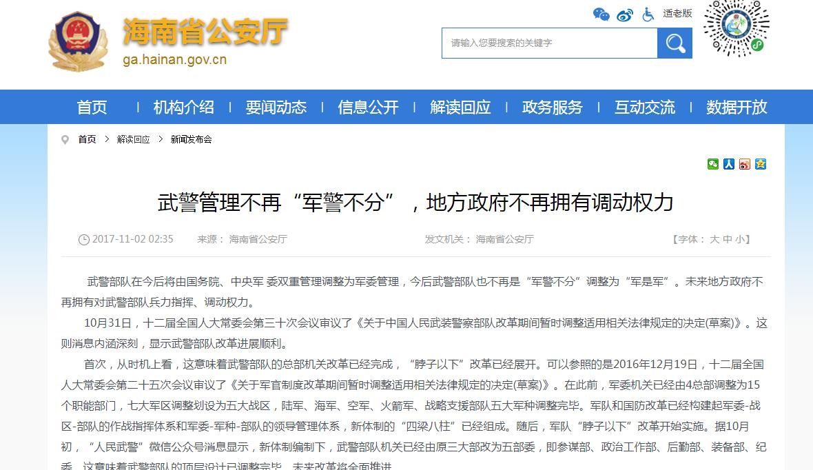海南省公安厅,武警管理不再“军警不分”,地方政府不再拥有调动权力