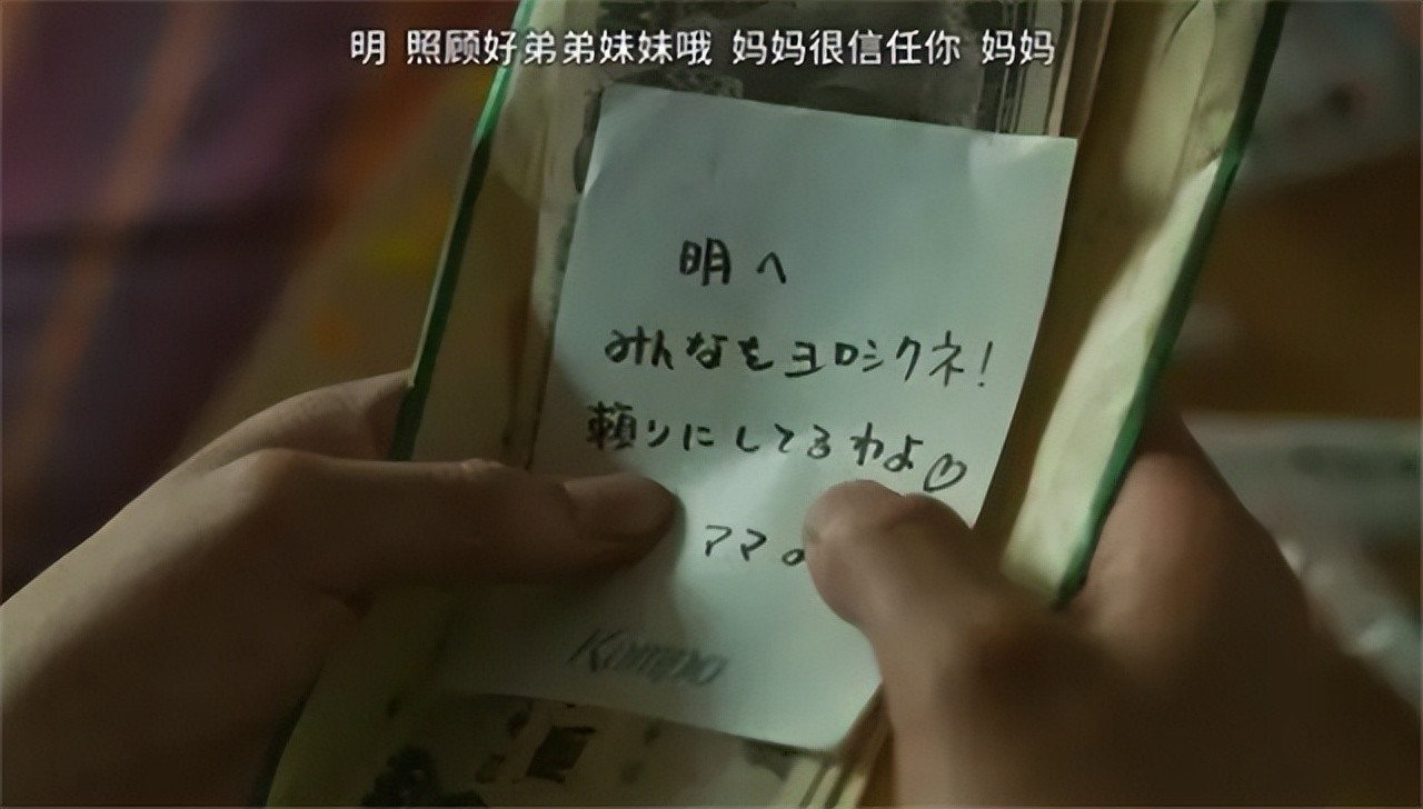 而是在残酷的基底上加入了很多温馨的内容,比如弟弟妹妹一直以为母亲把她们装在箱子里是为了玩游戏;便利店好心的小哥还分给他们临期的食物。