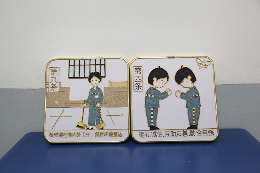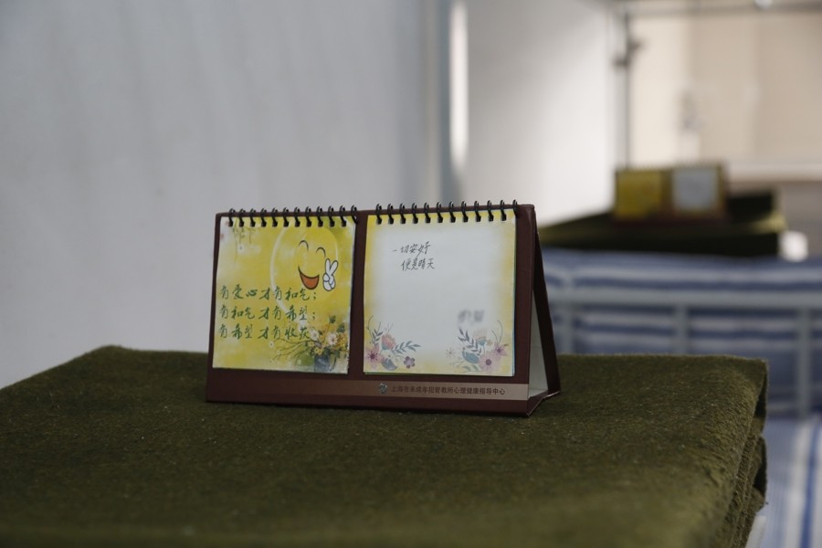 在监舍的走廊里,记者发现,走廊中贴着不少色彩鲜艳的贴画和鼓舞人心的标语。在每个监舍门旁,都挂着一块小白板。上面写着民警对未成年罪犯的寄语。记者看到,在其中一个监舍门前,民警用英文写下了爱尔兰诗人王尔德的名言:“就算身处深渊,也要仰望星空。”走进监舍,每块叠放整齐的“豆腐块”被褥上,都摆着一张心情卡片,在其中一张“笑脸”卡片上,未成年罪犯用铅笔写下“你若安好,便是晴天”。杨磊介绍,这是监狱从2000年左右开始推行的举措,心情卡有“开心”“难过”“愤怒”多种可选,罪犯们每天可以将自己的心情以及心里话写下来,激励自己,也方便和民警的沟通互动。在走廊尽头的一间小型教室里,记者看到一个迷你图书角,这些书籍是上海图书馆特地挑选送来的,一旁的展示架上展示了罪犯们研习掐丝珐琅、海派撕纸等非遗的成果。