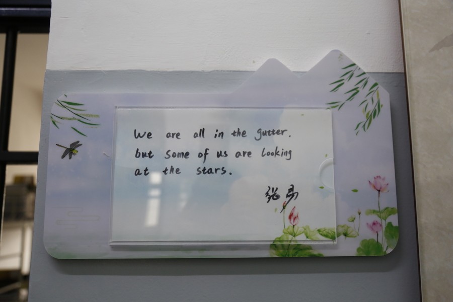 图说:监舍外,民警用英文写下爱尔兰诗人王尔德的名言:“就算身处深渊,也要仰望星空。”寄语犯下罪错的少年。
