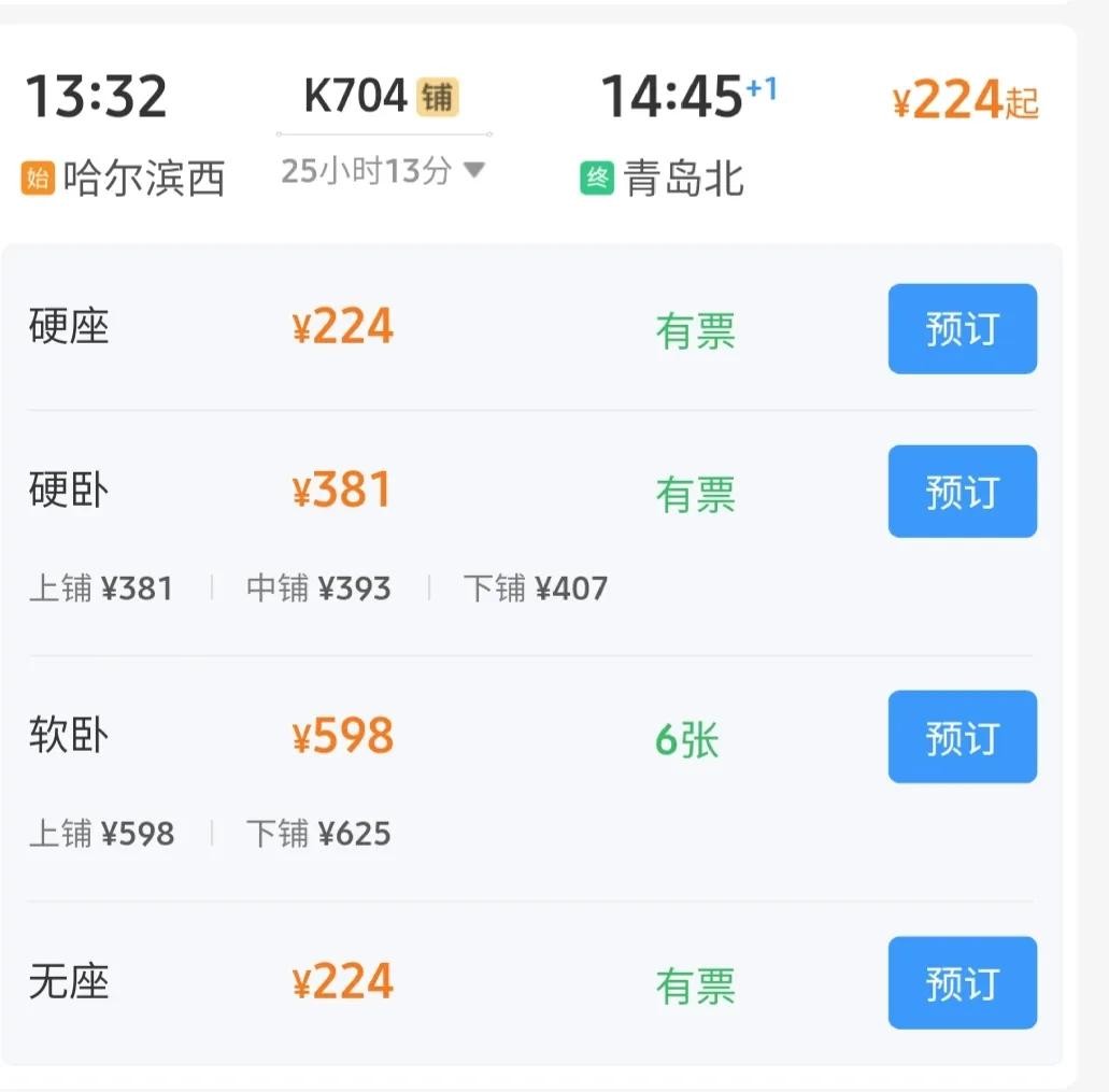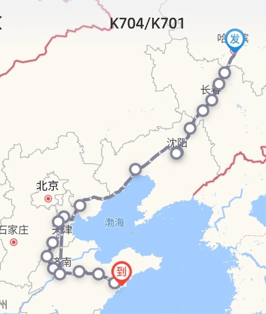 224元夕发朝至?哈尔滨直达青岛K704次快客:1990公里25小时20站
