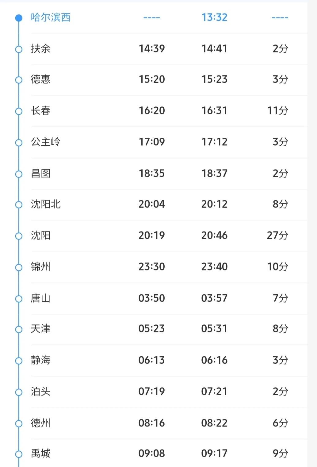 哈尔滨西、扶余、德惠、长春、公主岭、昌图、沈阳北、沈阳、锦州、唐山、天津、静海、泊头、德州、禹城、济南、淄博、潍坊、胶州、青岛北。