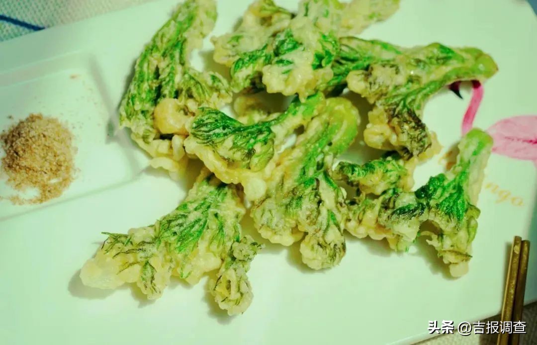 把新鲜的刺嫩芽先用沸水焯过,然后挂上鸡蛋面糊下油锅,炸到面糊变成金黄色就可以出锅了。