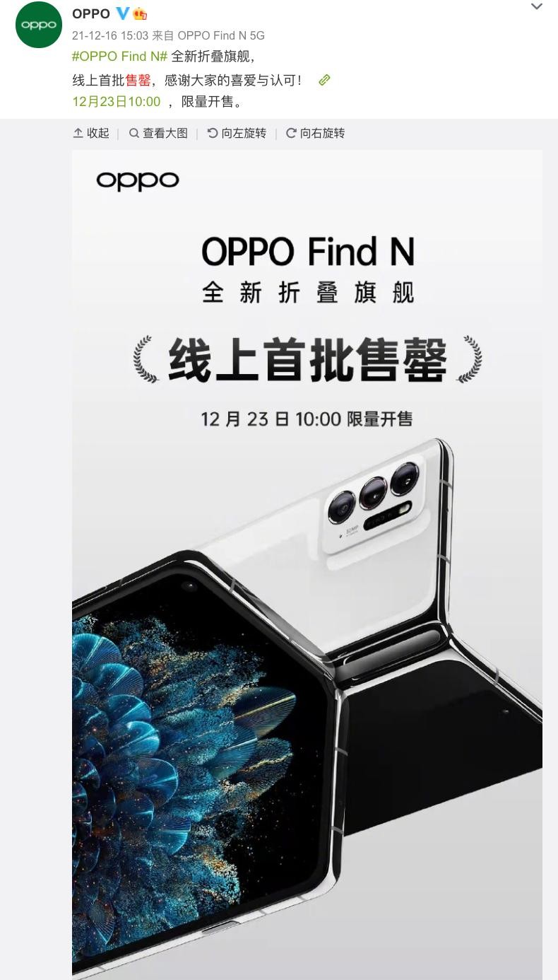 如上图所见,官方表示OPPO Find N线上和全渠道首批均已售罄,将于12月23日上午10点正式开售,海报上还有限量开售的字样。