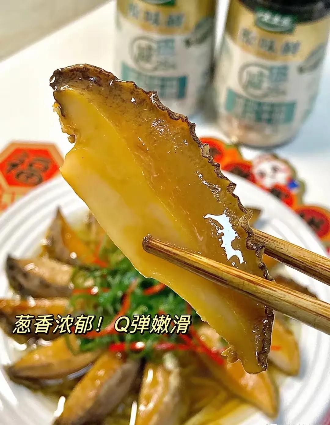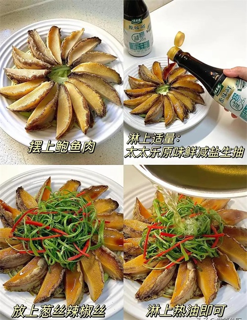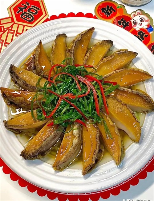 第二道,葱油鲍鱼,鲍鱼自古以来就是富贵吉祥的象征,葱油的香气更是让人垂涎欲滴,这道菜寓意着家业兴旺,富贵满堂。