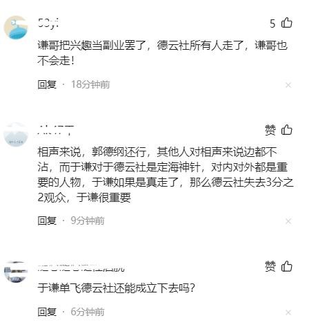 有人直言“德云社相声大会这么重要的演出都能缺席,可见于谦可能真要单飞了”,有人表示,“即便于谦离开了也能理解,毕竟德云社已经不志在相声艺术了”。