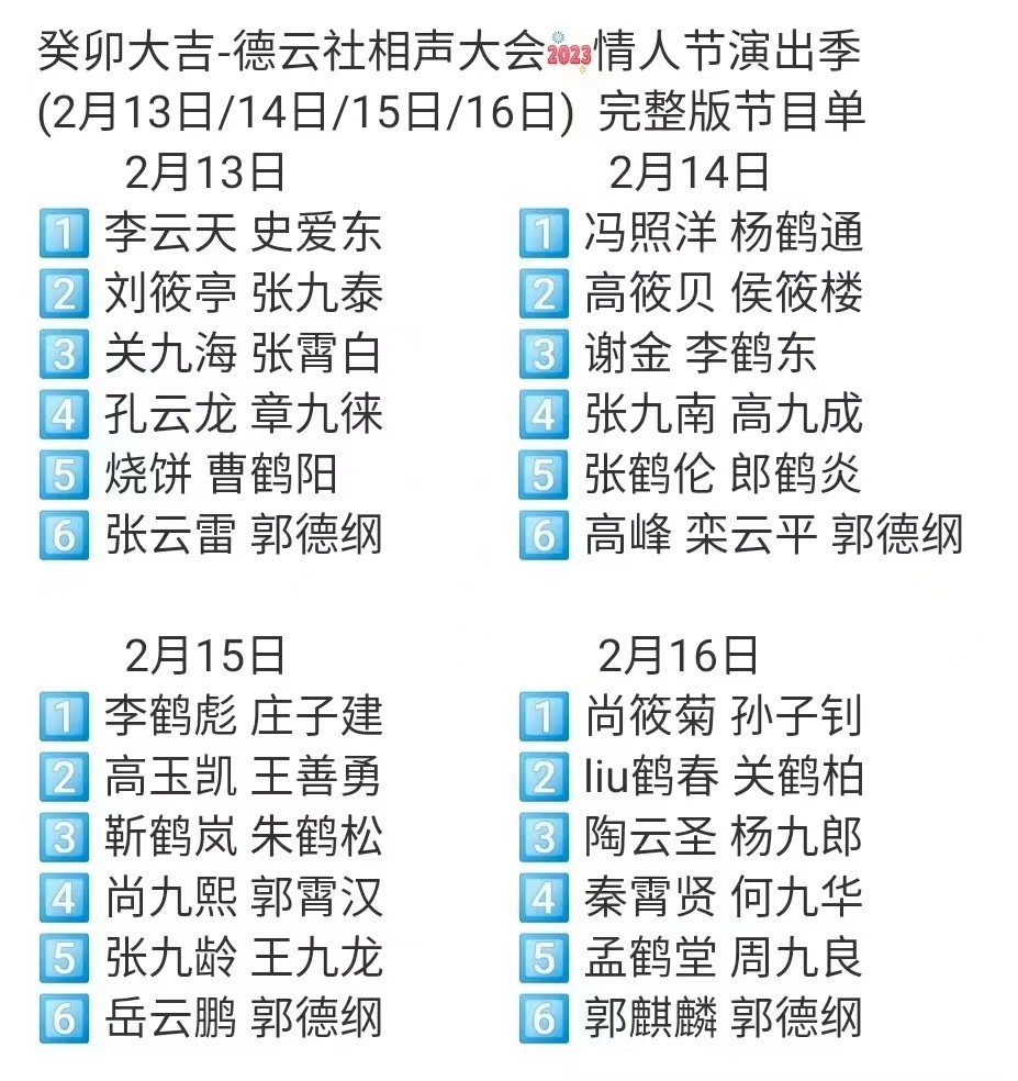 据悉,德云社近期举办了为期4天的相声大会,我们比较熟知的岳云鹏、高峰、烧饼、张九龄,杨九郎,秦霄贤等一众德云社知名相声演员均有表演。