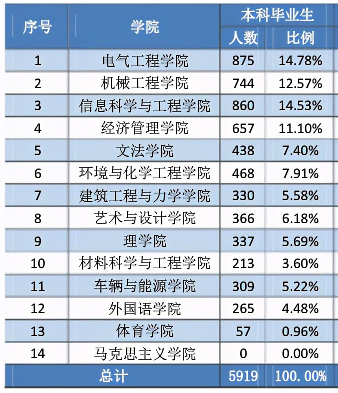 2020届本科毕业生分布在13个学院,其中毕业生人数较多的学院是:电气工程学院(占比14.78%)、信息科学与工程学院(占比14.53%)、机械工程学院(占比12.57%)、经济管理学院(占比11.10%)。