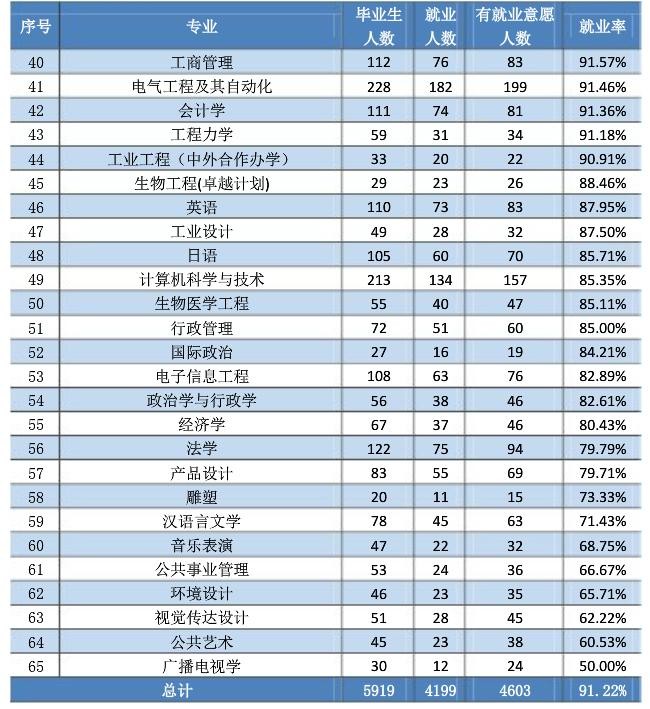 2020届本科毕业生共分布在全校的65个专业,其中有55个专业的就业率达到80%以上。其中,就业率低于70%的专业是:广播电视学(50.00%)、公共艺术(60.53%)、视觉传达设计(62.22%)、环境设计(65.71%)、公共事业管理(66.67%)、音乐表演(68.75%)。