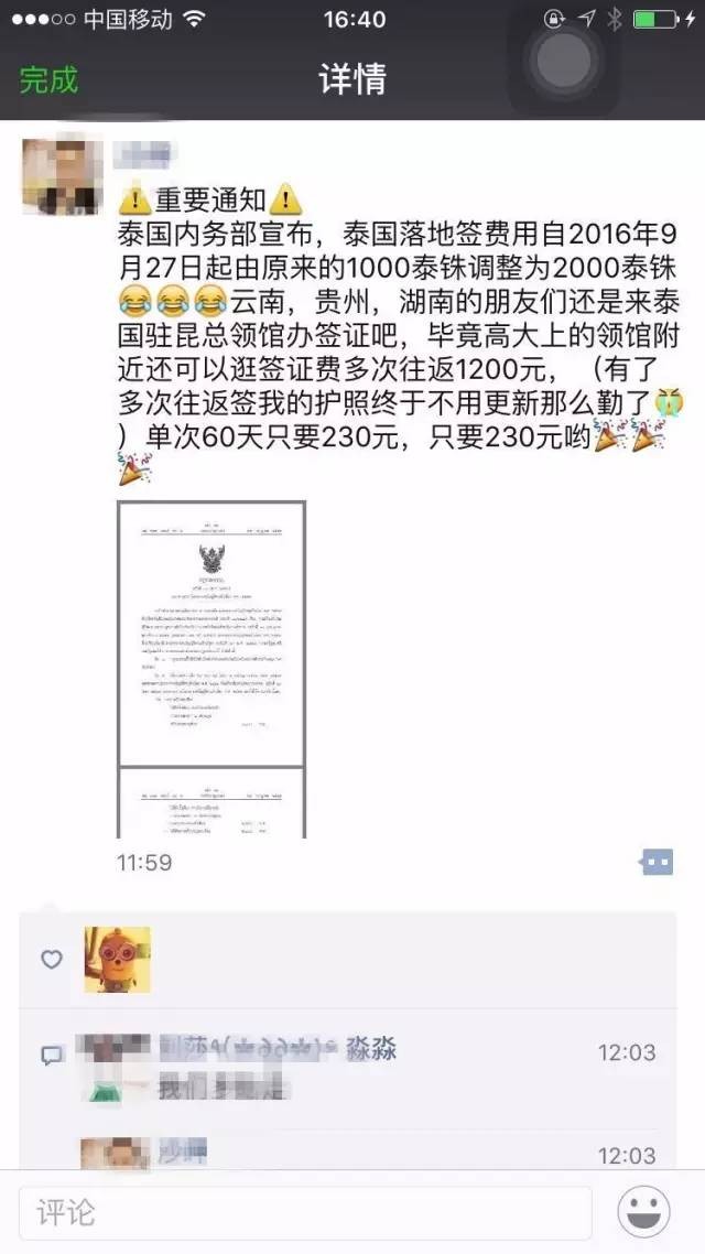 为什么会在朋友圈里引起这么大反应?因为泰国落地签很方便呀,只要在抵达泰国后出示有效期6个月以上的护照、签证申请表(可以在落地申请柜台填)、2寸彩照、入境后15天之内有效的返程机票行程单、入境时个人必须携带20000泰铢现金或等值的外币,就可以办理落地签啦,相比在国内大使馆办签证的230元人民币的费用外加存款证明、工作证明神马的,真是方便又实惠。