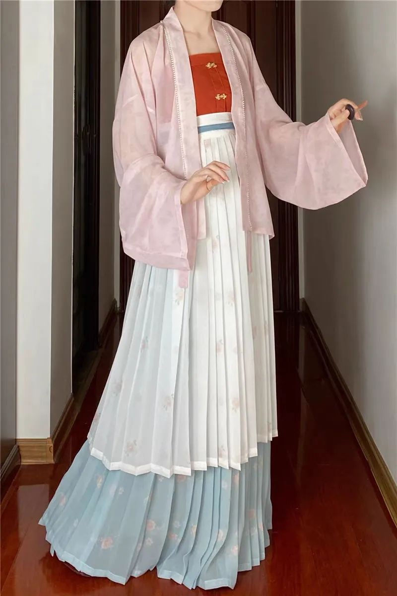 2. 襦裙式:襦裙式汉服上衣与裙子分开,上衣襦、裙子裙,多以对襟或交领的形式设计。襦裙式汉服适合大部分身形,尤其是身材稍微丰满的人。这种形制的汉服能够修饰腰部线条,展现出优雅的曲线。