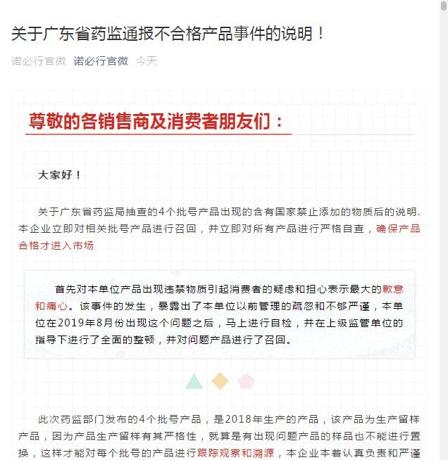 《说明》中称,该事件的发生,暴露出了单位以前管理的疏忽和不够严谨,诺必行在2019年8月份出现这个问题之后,马上进行自检,并在上级监管单位的指导下进行了全面的整顿,并对问题产品进行了召回。并立即对所有产品进行严格自查,确保产品合格才进入市场。