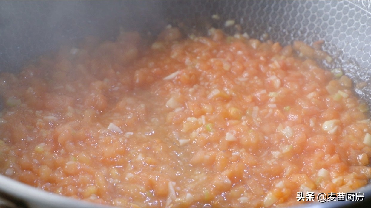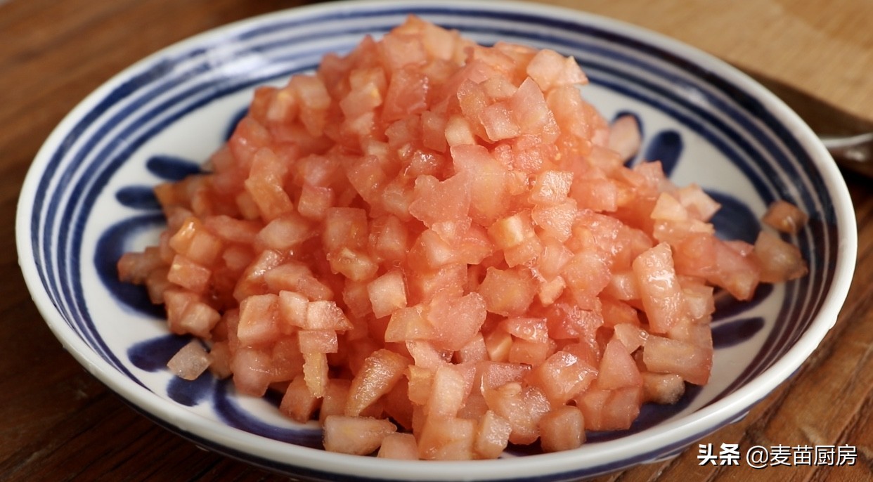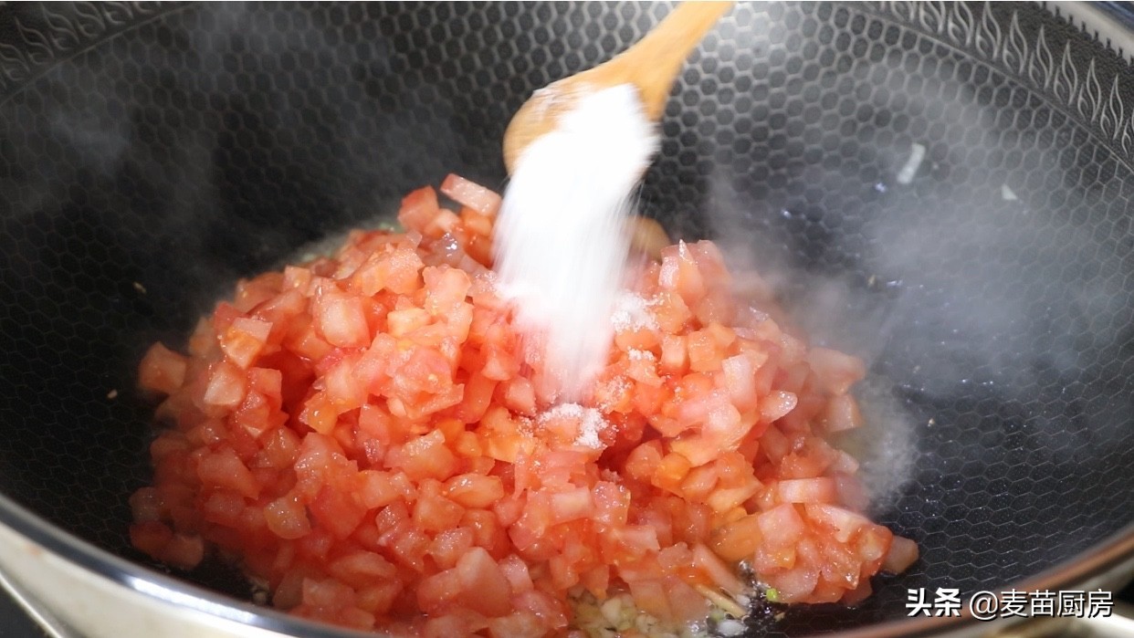 香味出来后,倒入西红柿丁。先加入食用盐,这样可以快速炒出西红柿里面的汁水。