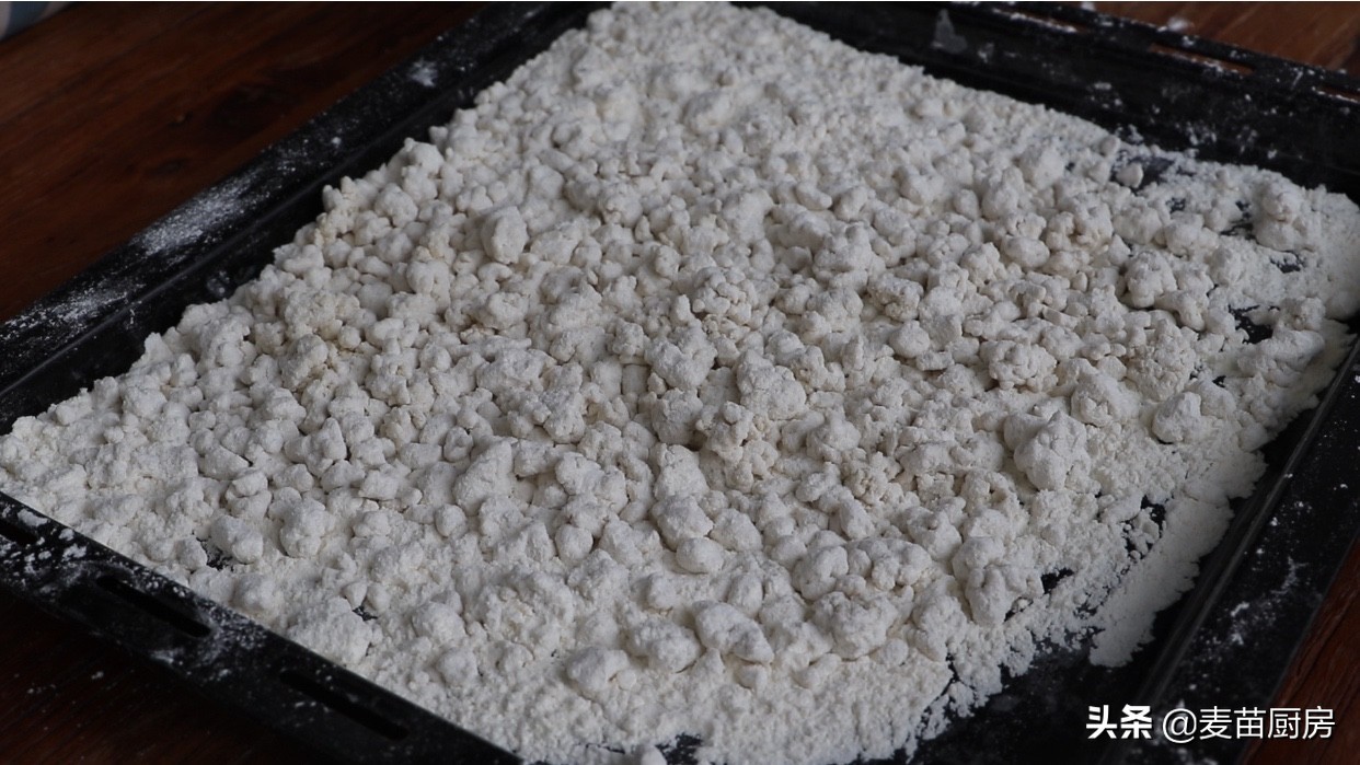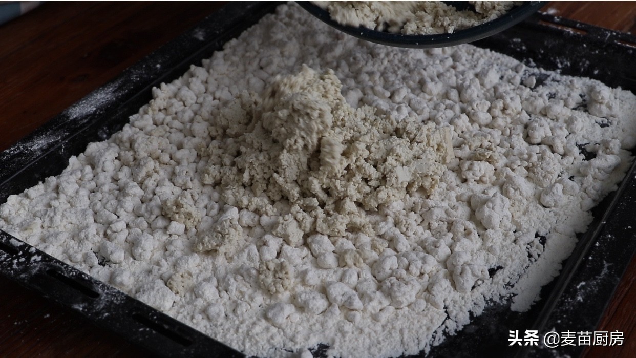 用叉子先把面粉搅拌均匀。接下来继续摇盘子,一直摇到有粒粒分明的面疙瘩出现,像这样粒粒分明不粘连。如果粘连,撒上一点干面粉,搅拌均匀就可以了。