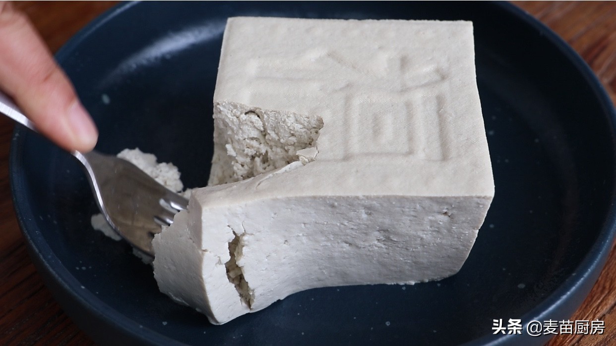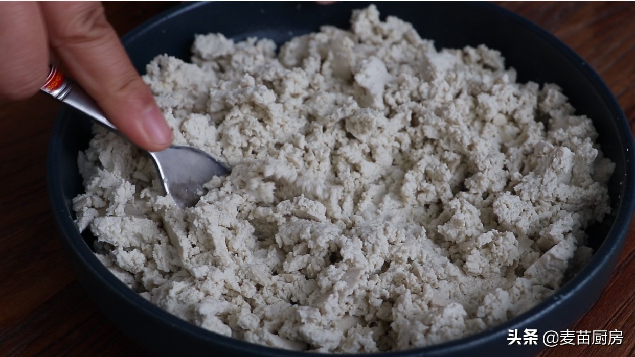 豆腐我们选用老豆腐,压成这样比较细碎的豆腐渣,就可以了。