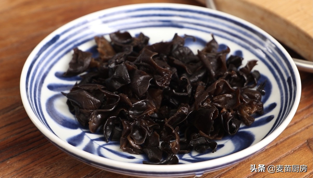 3、再准备一把提前泡发的木耳,把它切成小块,装入盘中。