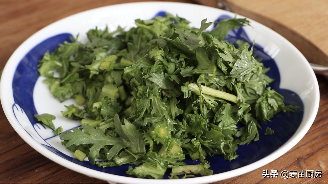 2、下面再准备一把自己喜欢吃的青菜,我这里用的是茼蒿,洗干净把它切成小段,然后单独装入盘中。