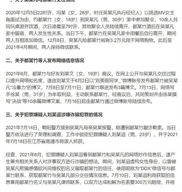 2021年7月都美竹的爆料,才让大众再次认清了此人丑陋的面容。随着警方的调查跟进,吴亦凡做的事情终究瞒不住了。7月31日晚,警方发布通报吴亦凡因涉嫌强奸而被刑拘,引发一片哗然。