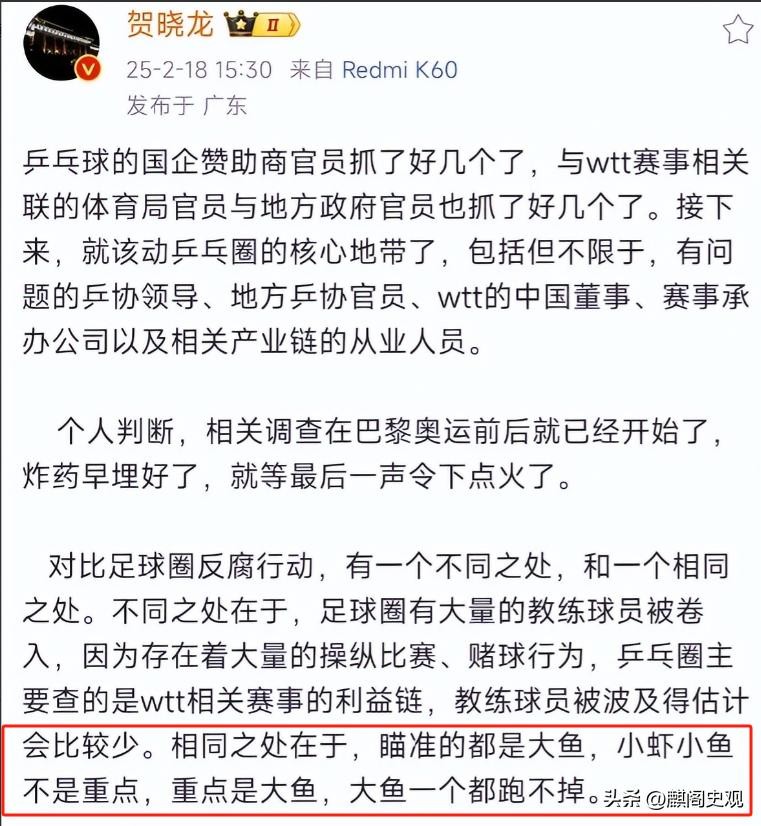 知名体育记者贺晓龙,在2月18日发布了一则微博,里面透露了乒乓球圈内部的反腐问题,直言与WTT(国际兵联)相关的几个官员都以下台。
