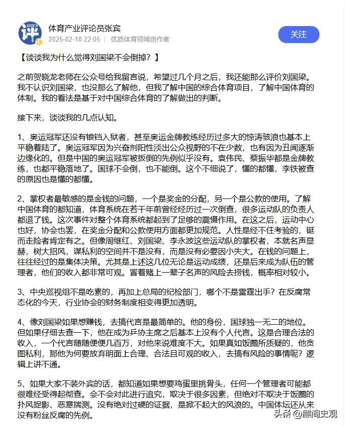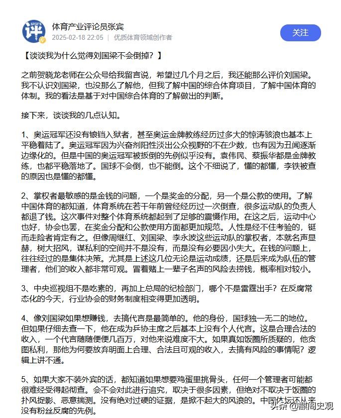 面对这些质疑,知名体育记者张宾在昨晚发长文,坚称刘国梁不会倒掉,为此他还给出了5大理由。