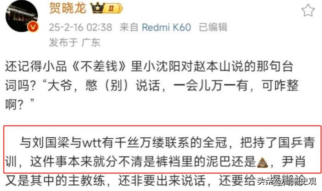 这还没完,仅仅过去两天后,贺晓龙再次发文曝光了“国乒反腐问题”,同时他还指出刘国梁身居高位难逃其咎。